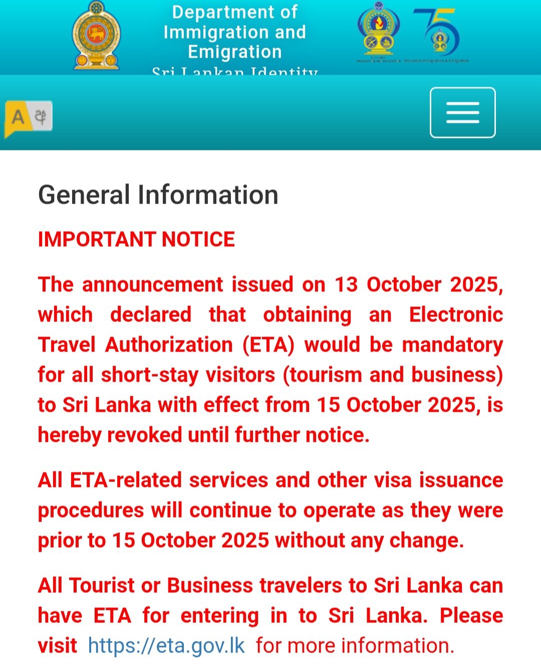 The announcement issued on 13 October 2025, which declared that obtaining an Electronic Travel Authorization (ETA) would be mandatory for all short-stay visitors (tourism and business) to Sri Lanka with effect from 15 October 2025, is hereby revoked until further notice.