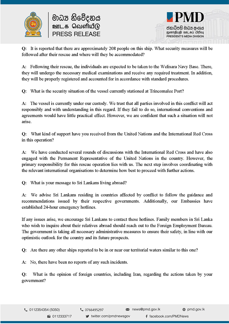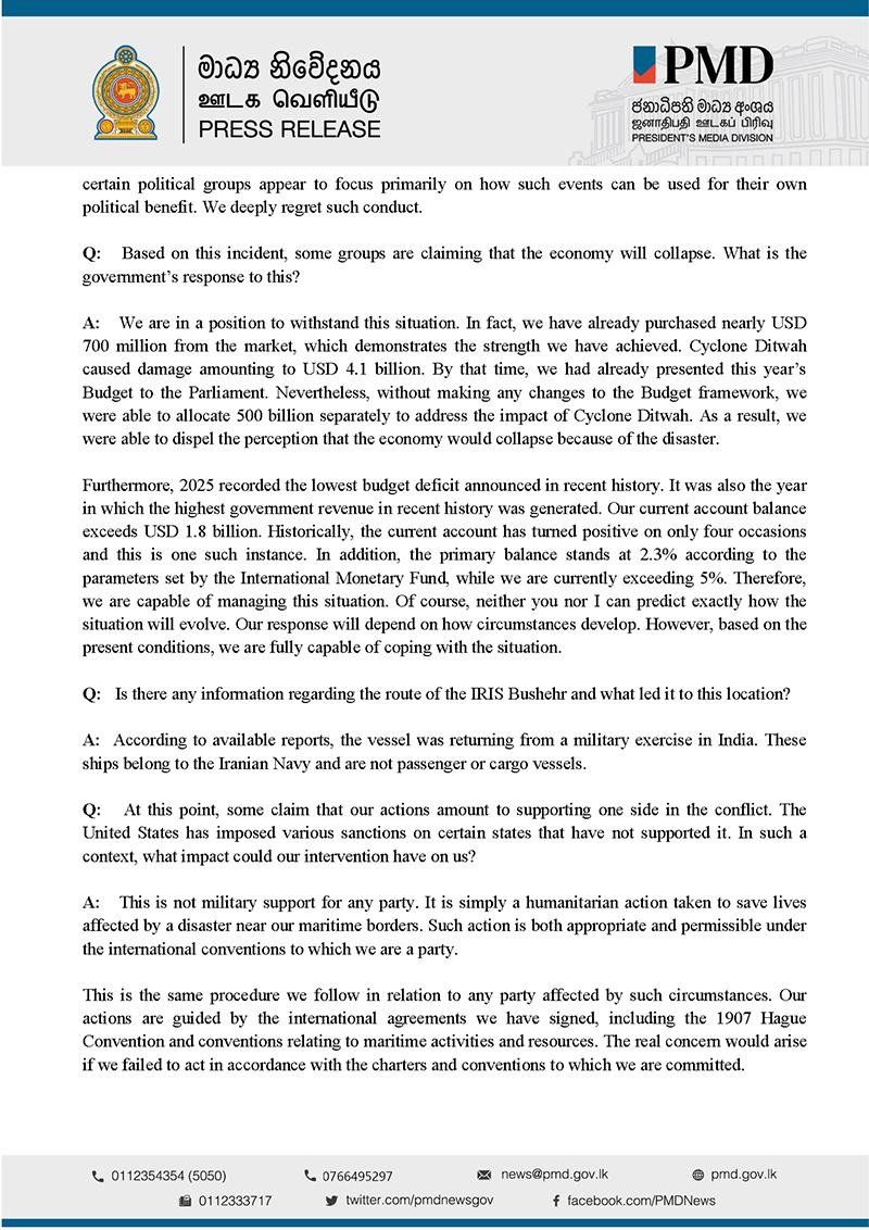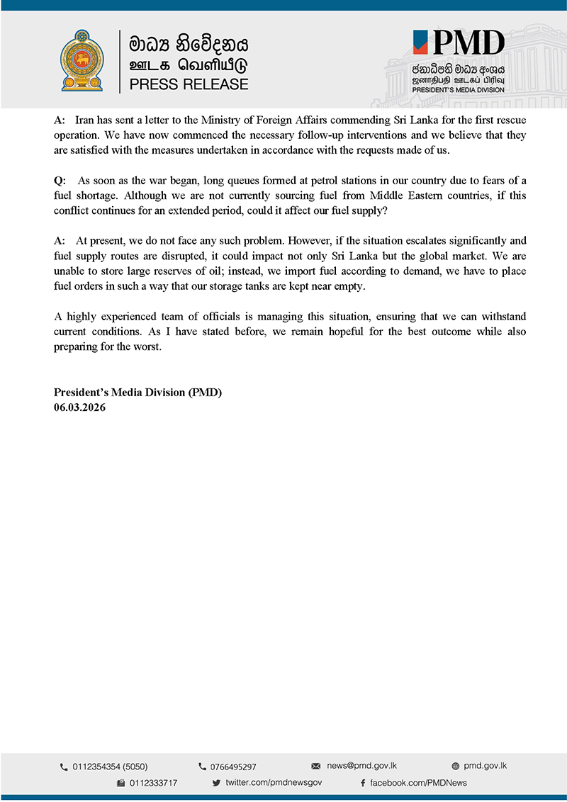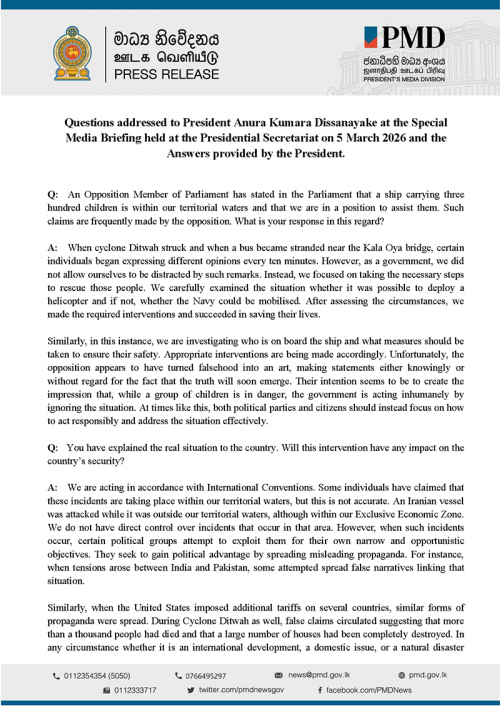 Questions addressed to President Anura Kumara Disanayaka at the Special Media Briefing held at the Presidential Secretariat on 5 March 2026 and the Answers provided by the President.