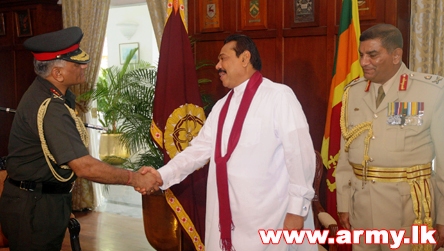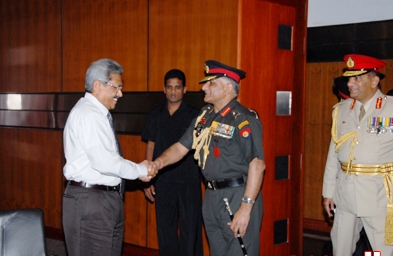 The visiting General Vijay Kumar Singh, accompanied by Lieutenant General Jagath Jayasuriya, paid a courtesy call on HE, the President Mahinda Rajapaksa at Temple Trees. The visiting Army Chief extended his warm greetings to the President and expressed his pleasure over efforts, being launched to bring prosperity to the country by the government of Later on, the visiting Army Chief arrived at Visumpaya to call on Hon Prime Minister D M Jayaratne where both of them had a brief exchange of views on matters of bilateral concern. Indian Army Chief calls-on Secretary Defence